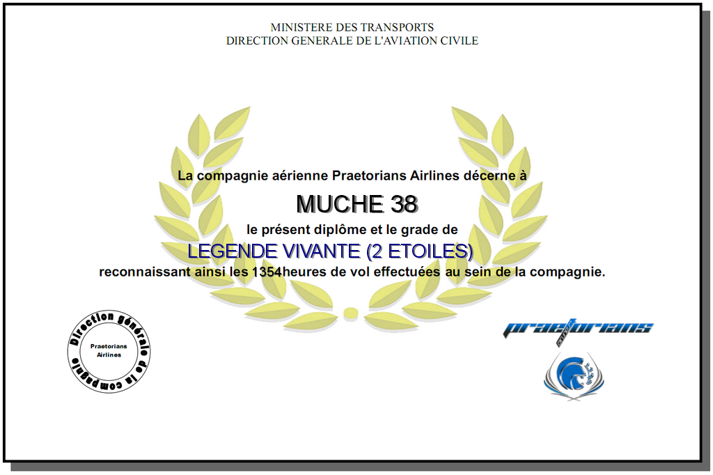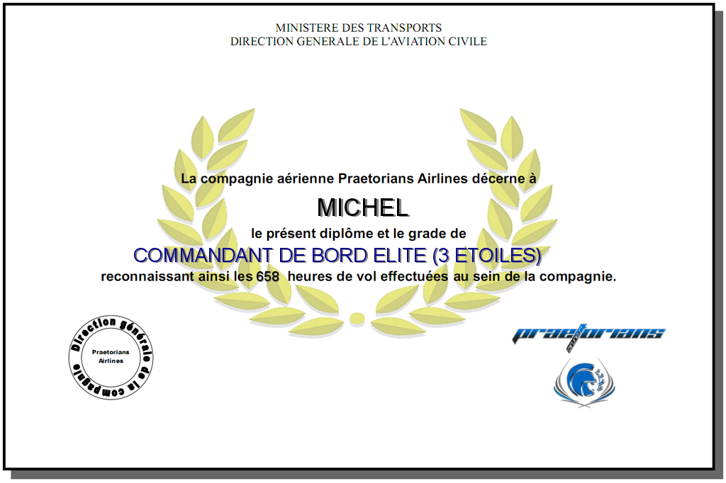| Pilote | Vols | Appareil préféré | Dernier vol | PAX | Aéroports visités | Distance | Tps de vol | Opinion | Points | Bonus moyen | Malus moyen | Grade | Insignes | Diplôme |